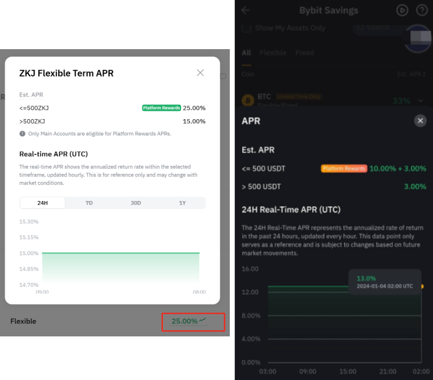 Flexible Term products offer tiered interest rates based on the amount of assets you invest. The APR varies by tier and may change depending on market conditions. On the Bybit website, a tiered APR is indicated by a dotted underline, while in the Bybit App, it appears in orange.