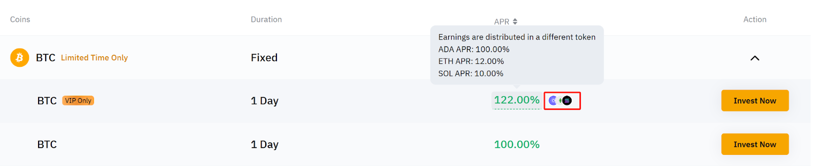 Some Fixed Term plans allow you to earn yields in one or more coins different from the one you invested in, helping you diversify your rewards without any extra effort. For example, by investing in BTC, you may earn rewards in BTC, ETH and USDT.