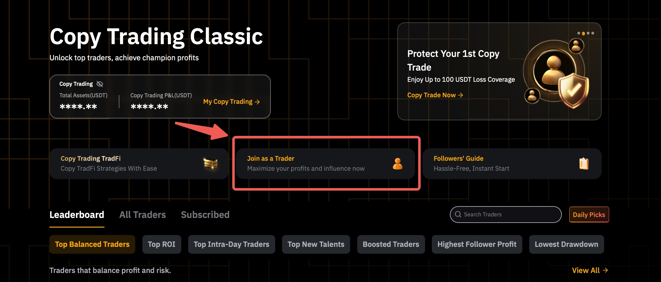 Transfer to Master Trader Account: Transfer a minimum of 100 USDT from any account within your Main Account to this Master Trader Account