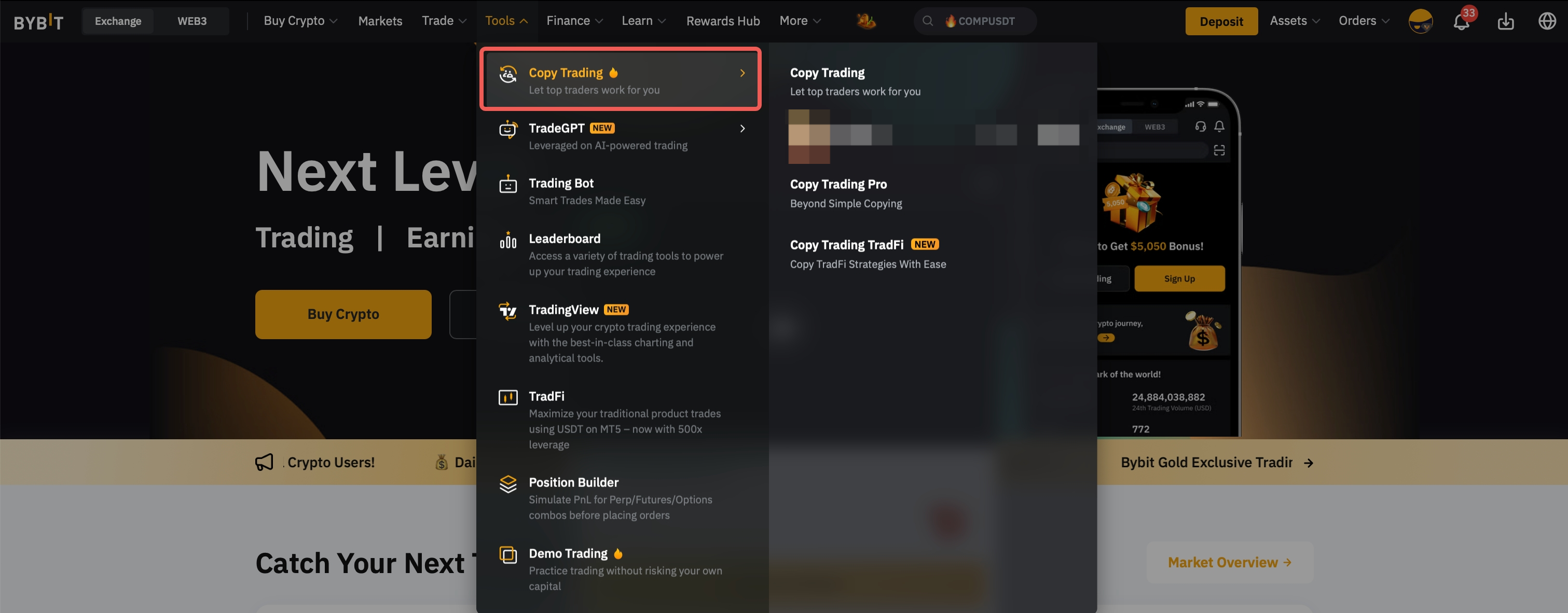 Step 2: Please click on Tools → Copy Trading in the navigation bar to enter the Discover Top Traders page.