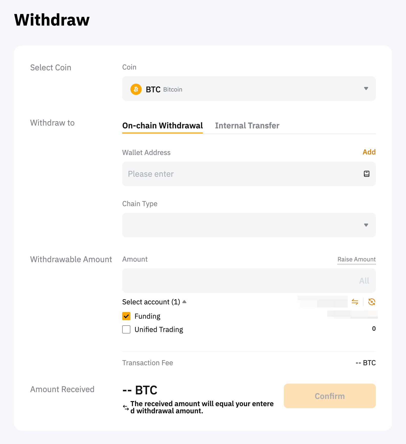 Step 2: Fill in the available address column with your Wallet address. Then, select the Chain Type and enter the amount you wish to withdraw to your Wallet.