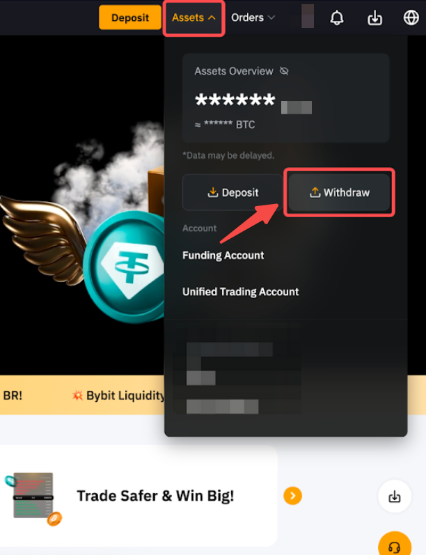 Step 1: Hover your cursor over Assets in the upper right corner of the Bybit page, then select Withdraw.