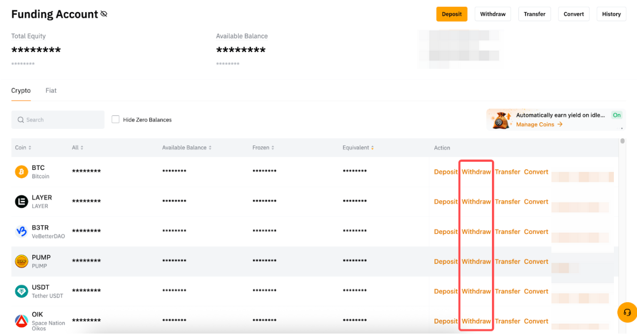 Alternatively, please head to your Funding Account page and click on Withdraw under the coin you would like to withdraw.