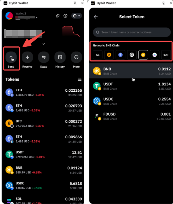 Step 3: Click on Send and paste your Wallet address into the input box. Please make sure you choose BSC, otherwise, your USDT and BNB may not be transferred successfully.