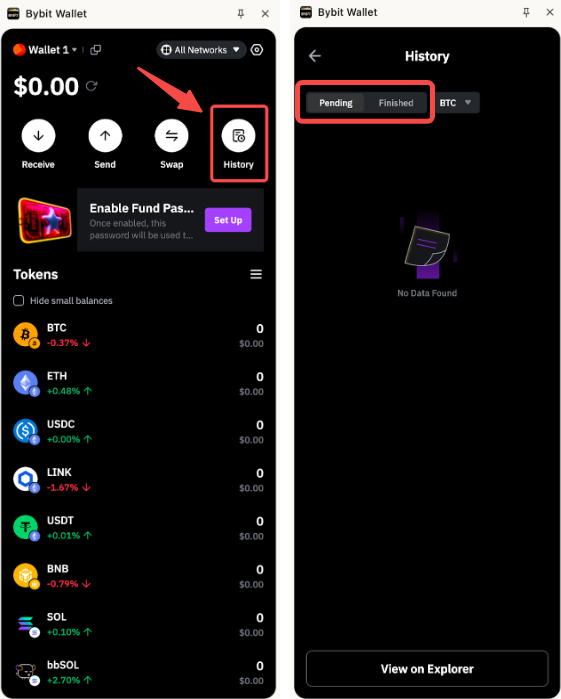 Click on History on your Bybit Wallet portal to view your deposit and withdrawal history under the Pending and Finished tabs.