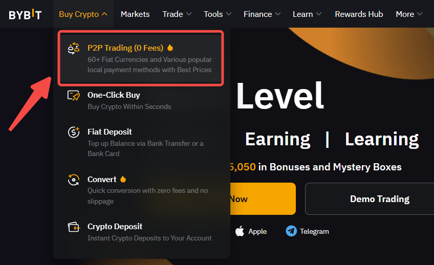 Step 1: Please click on Buy Crypto → P2P Trading on the top left corner of the navigation bar to enter into the P2P trading page.