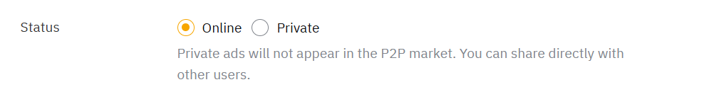 1. Public: The ads will be displayed on P2P advertisement page and the other traders can place an order with you.