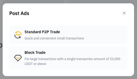 Step 3: Click either P2P Trading or P2P Block Trade. For eligibility for posting an advertisement, please refer to this page.