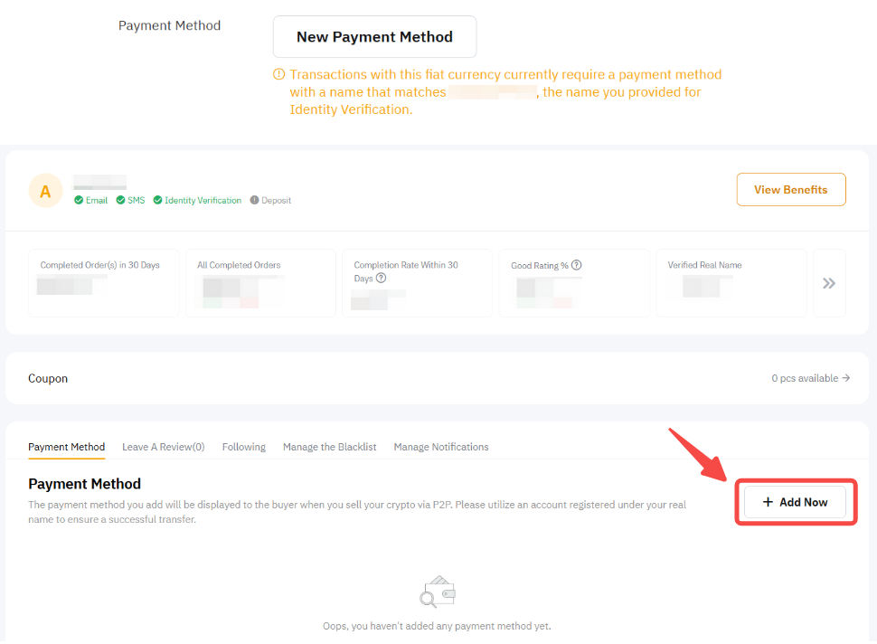 Click on Manage Payment Method and you will be directed to the P2P User Center to add your payment method.