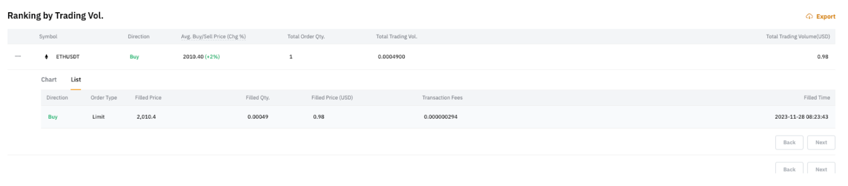 In the List tab, you can access all trades associated with the position. This tab exclusively displays fully closed positions. For order details related to partially closed positions, you can refer to Details of Closed Orders under Trading Performance.