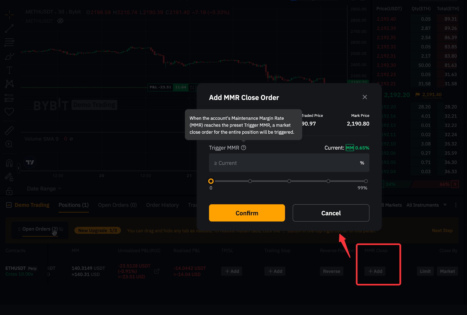 MMR Close will automatically place a market order to close the selected position in full if your account's maintenance margin rate (MMR) reaches the preset trigger level. For more information, visit Maintenance Margin Rate (MMR) Close Order.