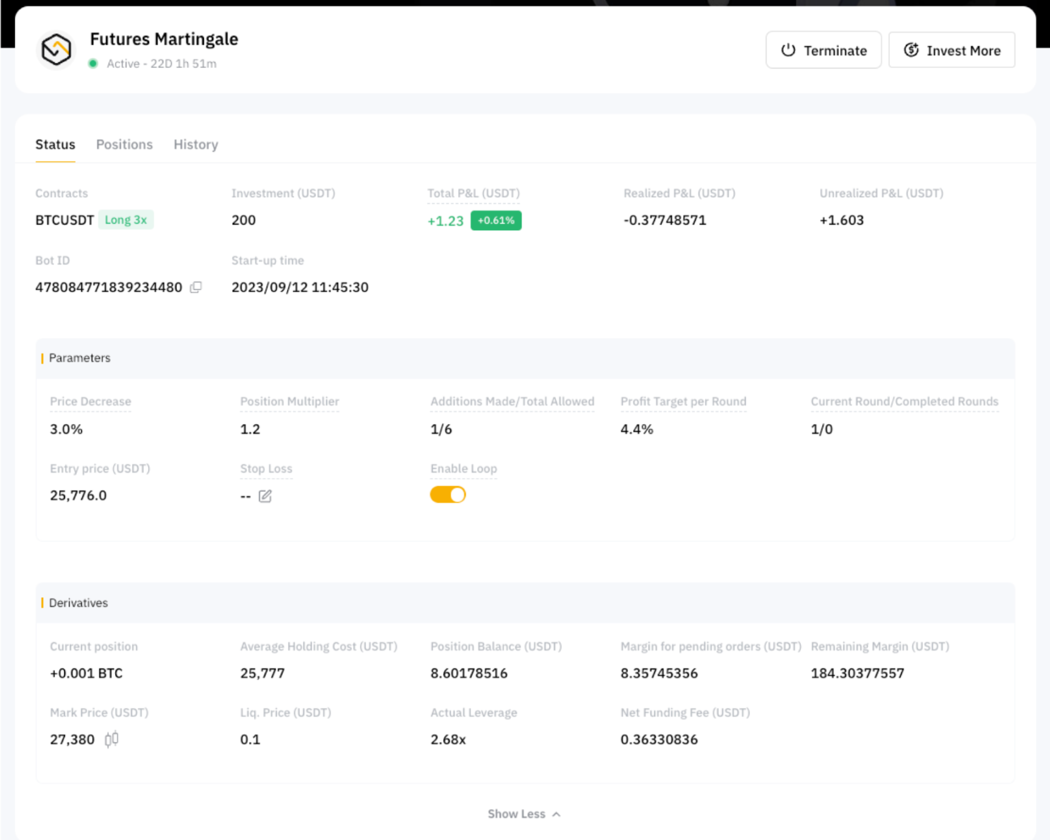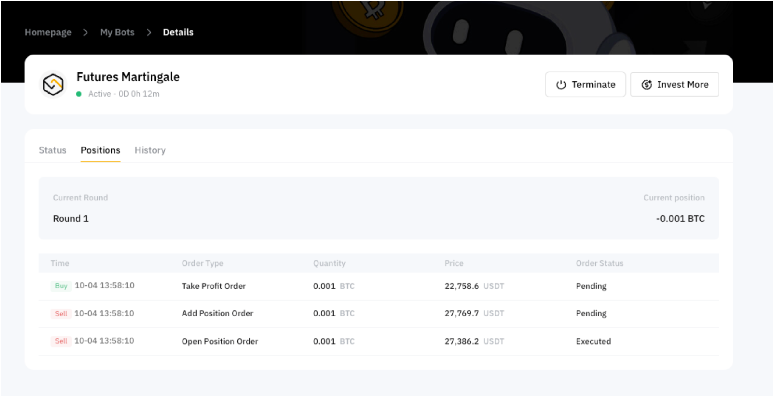 En la página Detalles del bot, encontrarás información completa sobre el bot de futuros Martingale, incluidos los parámetros que has configurado. Además de estos ajustes, hay otros datos cruciales que debes tener en cuenta:
