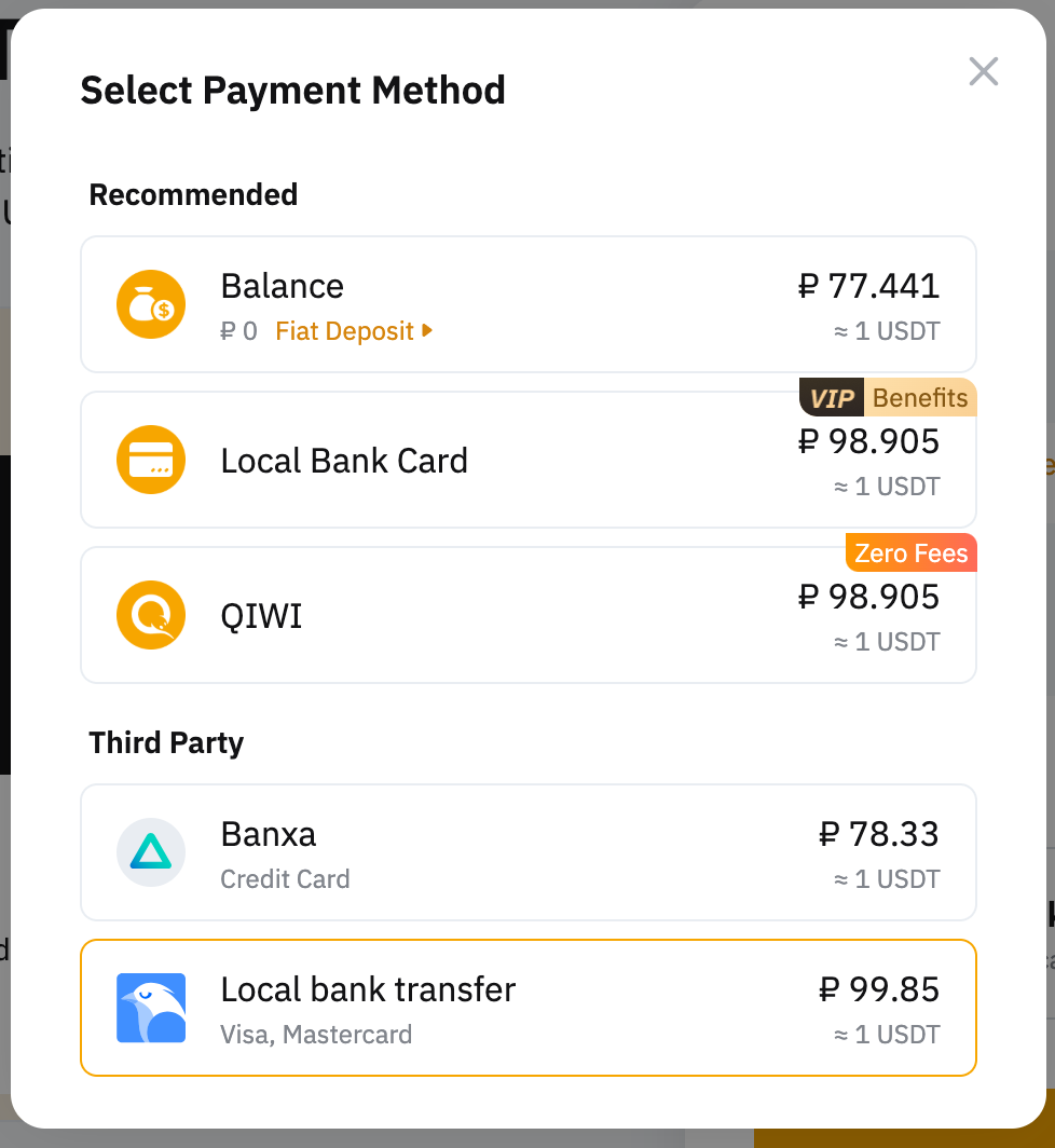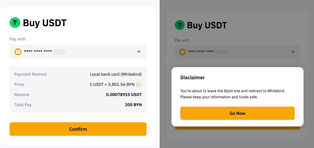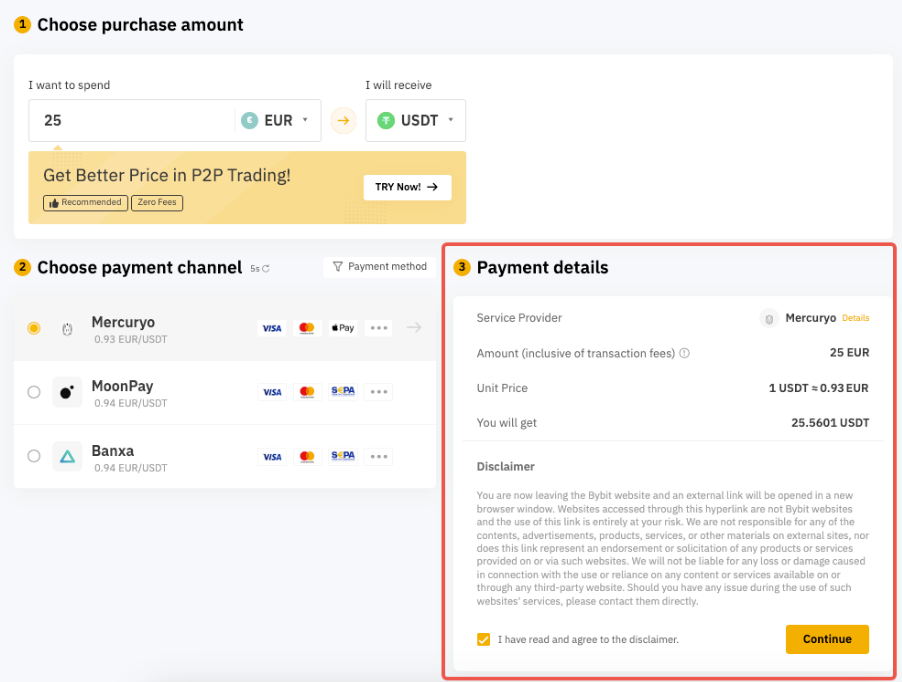 Antes de obtener más información sobre Compra Cripto con un clic Compra con canal de terceros, ten en cuenta que Bybit no maneja depósitos fiduciarios directamente, y este servicio lo manejan totalmente proveedores de pagos externos.