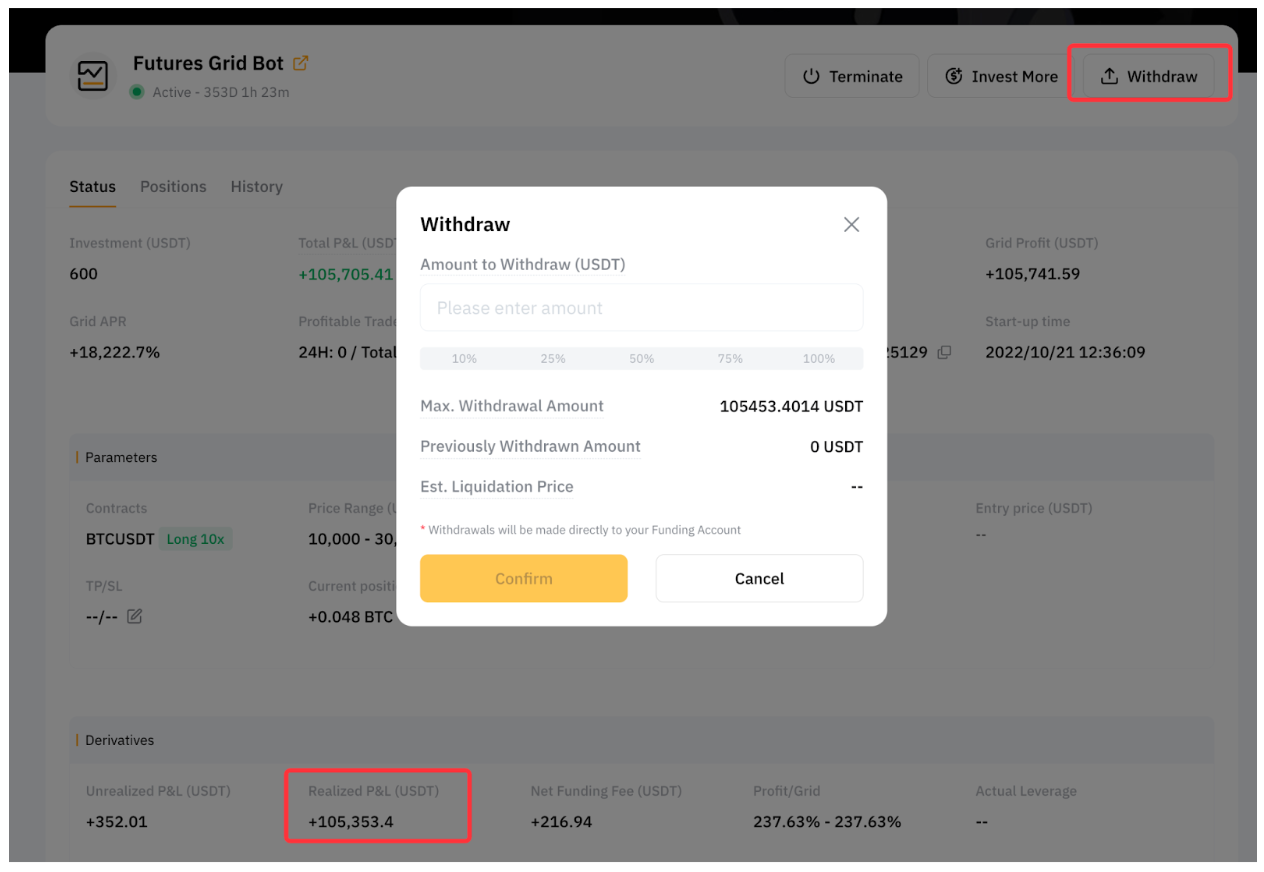 Saat bot grid Anda berjalan, setiap keuntungan akan tetap berada dalam bot. Setelah bot dihentikan, jumlah investasi dan keuntungan Anda akan ditransfer secara otomatis ke Akun Pendanaan Anda.
