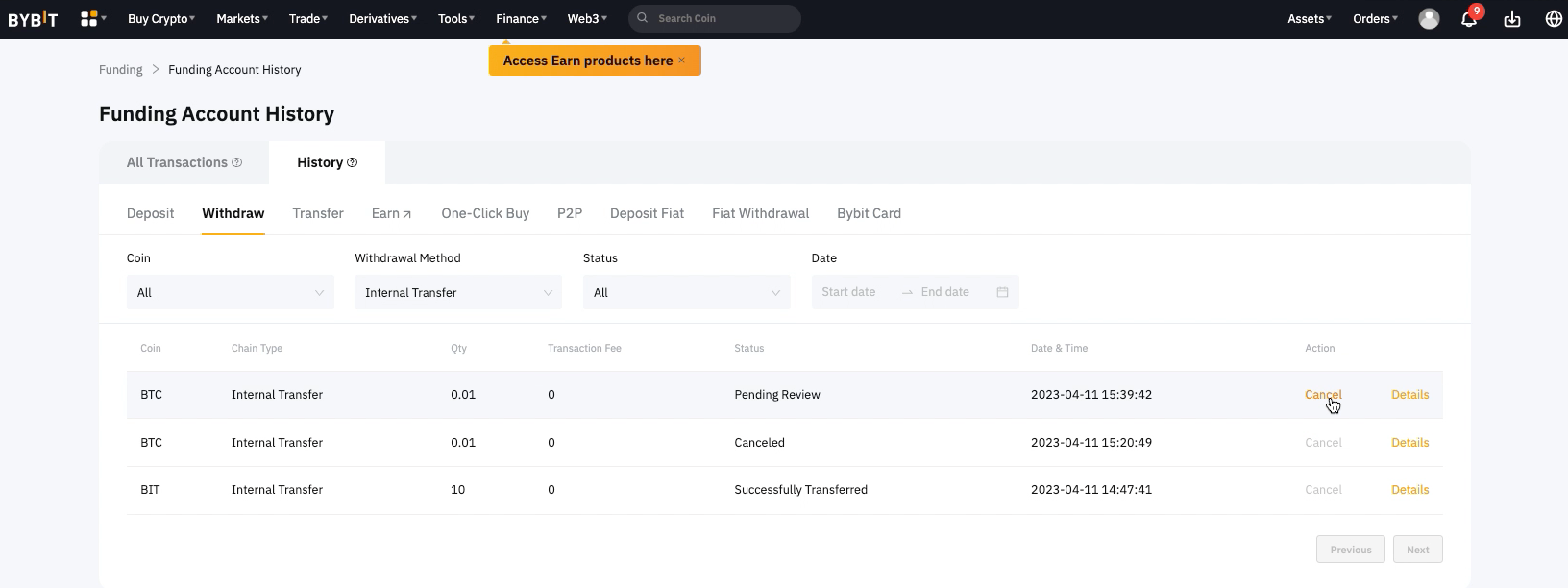 Berikut adalah panduan langkah demi langkah bagaimana cara membatalkan permintaan penarikan. Perlu diketahui, tidak ada biaya untuk membatalkan permintaan penarikan. Setelah pembatalan telah berhasil, jumlah penarikan yang diminta dan biaya penarikan terkait akan dikembalikan ke akun Bybit Anda.