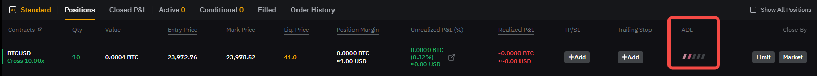 ADLランキングが最も高いトレーダーが最初にデレバレッジの対象として選択されます。トレーダーは、自身のポジションに表示されるADL優先度ライトを参照して、ADLランキングを把握できます。