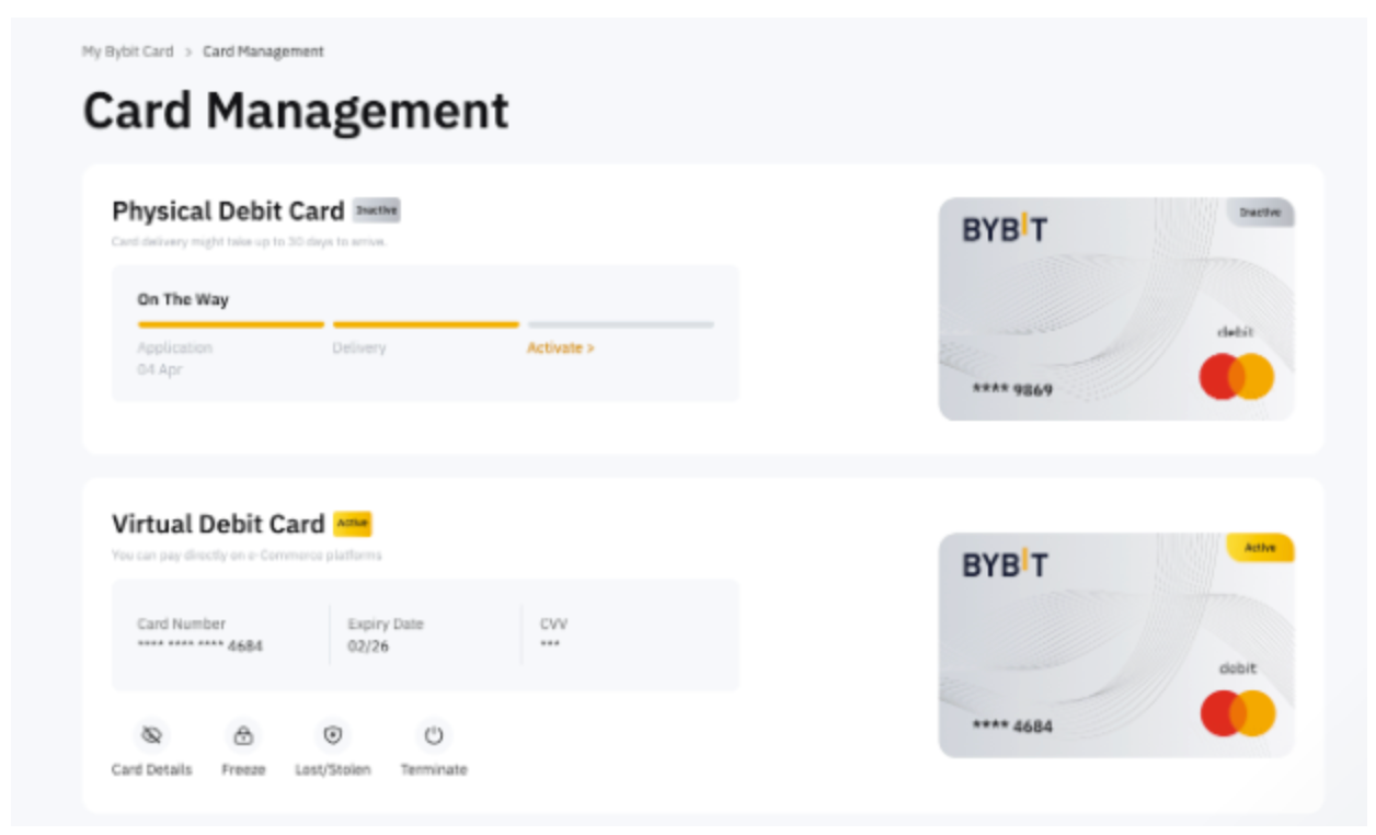 You can now manage both your virtual and physical Bybit Card on the Card Management page.