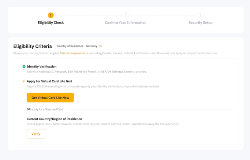 Before initiating your application for a Bybit Virtual Card Lite, please ensure that you are eligible and meet the following criteria: