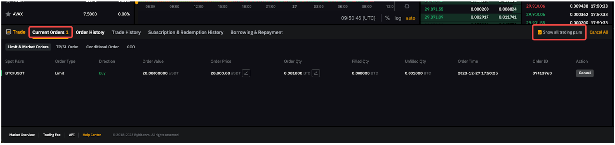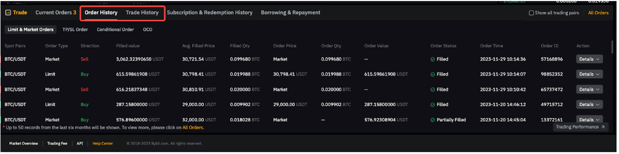 You can switch to the Order History or Trade History tab on the Spot Trading page to view up to 50 records from the last six (6) months. Similar to Current Orders, you can check the Show all trading pairs box to view order history or trade history from all trading pairs.
