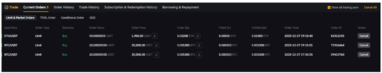 To cancel Spot orders, navigate to the Current Orders tab and click on Cancel. Alternatively, you can choose to Cancel All orders from the upper right corner. It's important to note that if you have selected the Show all trading pairs option, clicking on Cancel All will cancel orders from all trading pairs.