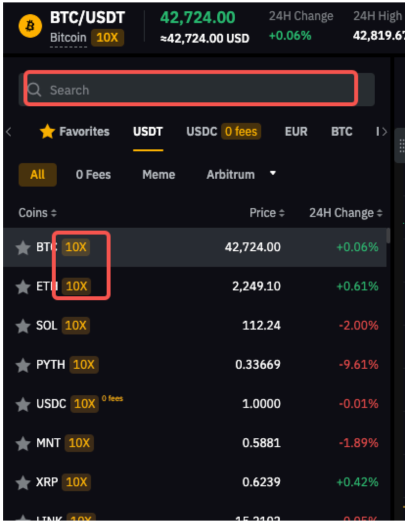 To quickly find the trading pair you desire, please use the search box to directly enter the trading pair you want to view. If you see a 10x label beside a certain trading pair, it indicates that the trading pair is supported in Spot Margin Trading.