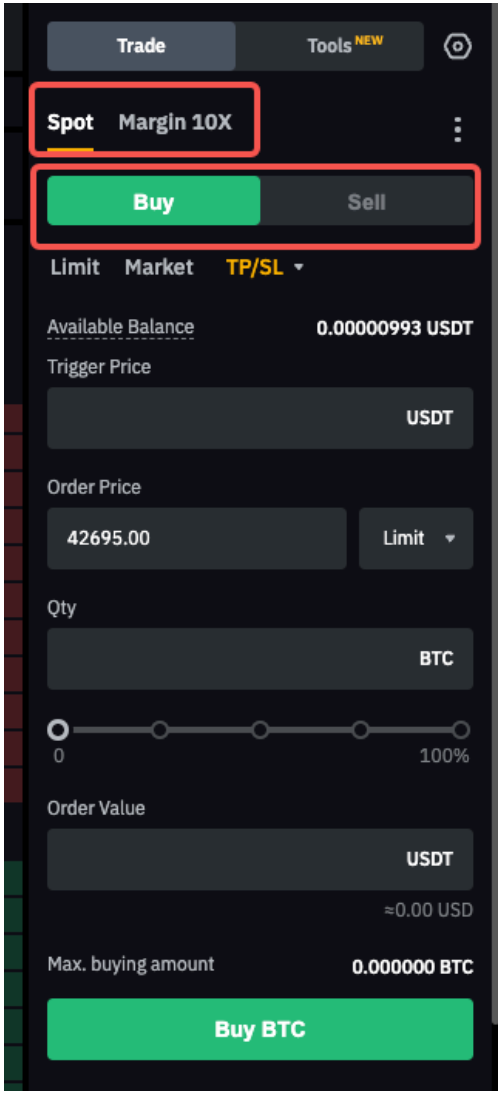 Step 1: To perform Spot Trading, please ensure you are currently in the Spot tab. Then, choose to Buy or Sell an asset.