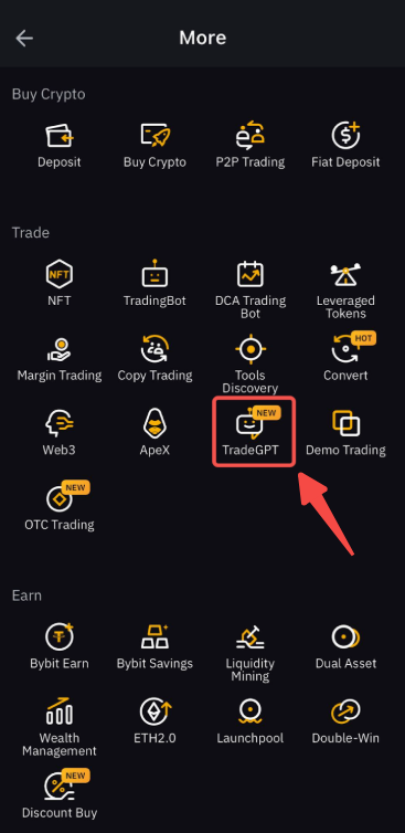 Bybit App users can access TradeGPT by clicking on More on the Bybit home page and selecting TradeGPT.