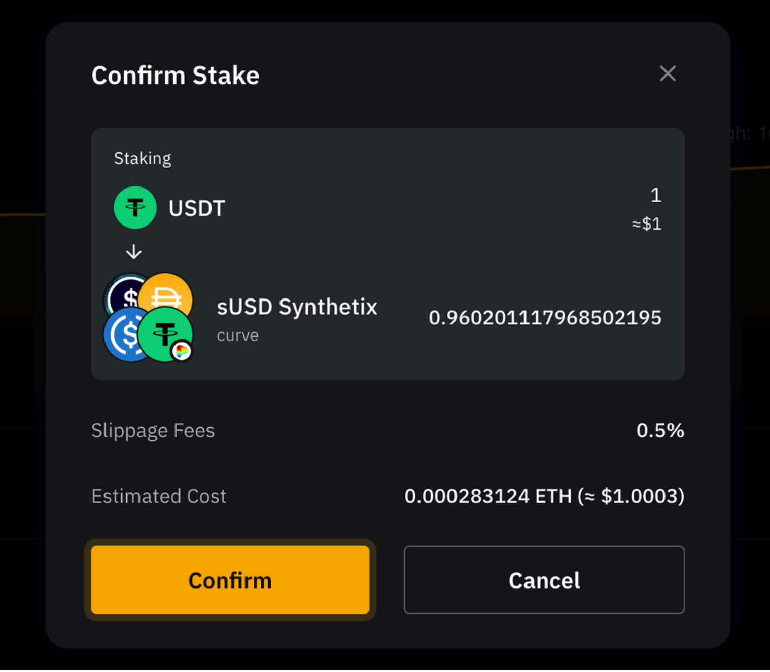2o passo: Na janela pop-up, verifique os detalhes da sua ordem de staking. Anote o slippage e o custo estimado e clique em Confirmar.