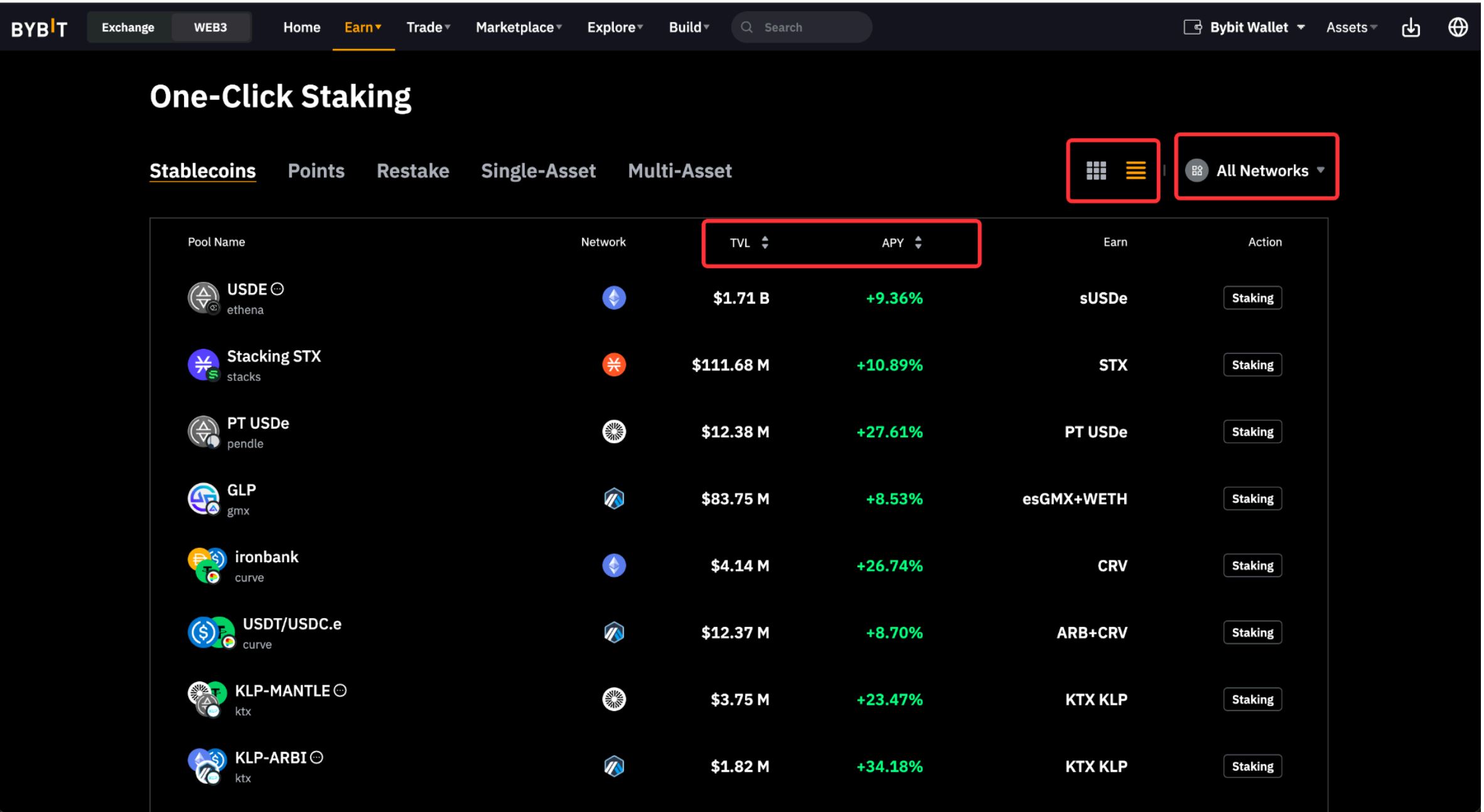 1o passo: Na página Staking, você pode visualizar todos os pools de staking disponíveis. Clique no ícone de grade ou lista para ajustar a exibição. Você pode organizar os pools de acordo com APR ou TVL ouclicar em Todas as redese visualizar pools de staking por rede.