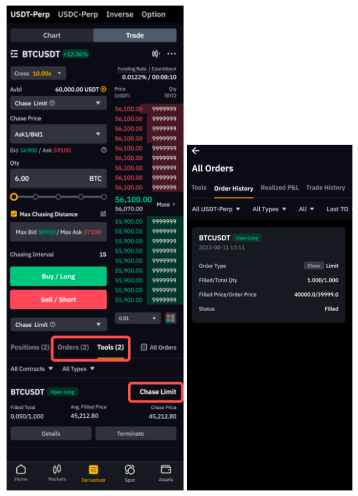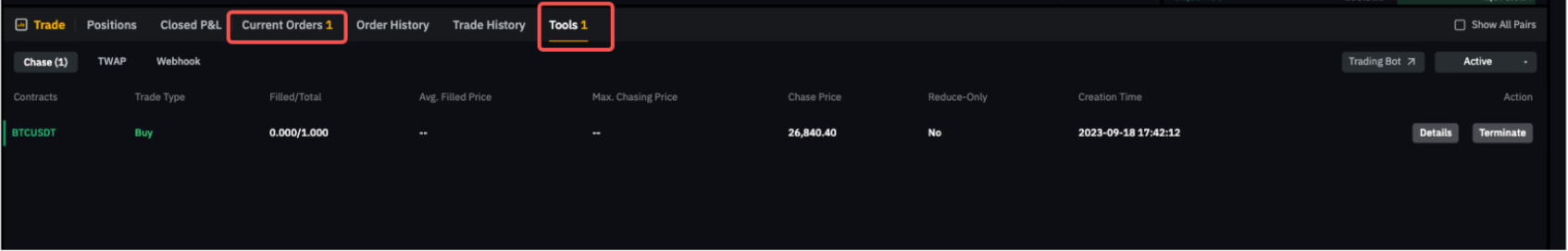 Виберіть вкладку Ордери або Інструменти, щоб переглянути поточні лімітні ордери зі слідуванням. Щоб переглянути виконані або скасовані лімітні ордери зі слідуванням, перейдіть до Історія ордерів, і ви побачите лімітні ордери зі слідуванням з позначкою Chase.