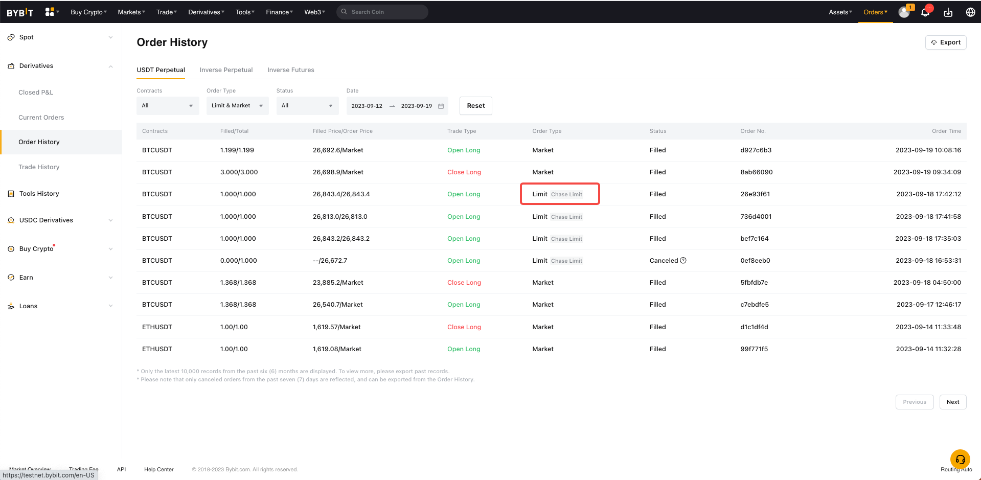 Після виконання або скасування ордера ви можете переглянути деталі на сторінці Історія ордерів з позначкою Chase Limit.
