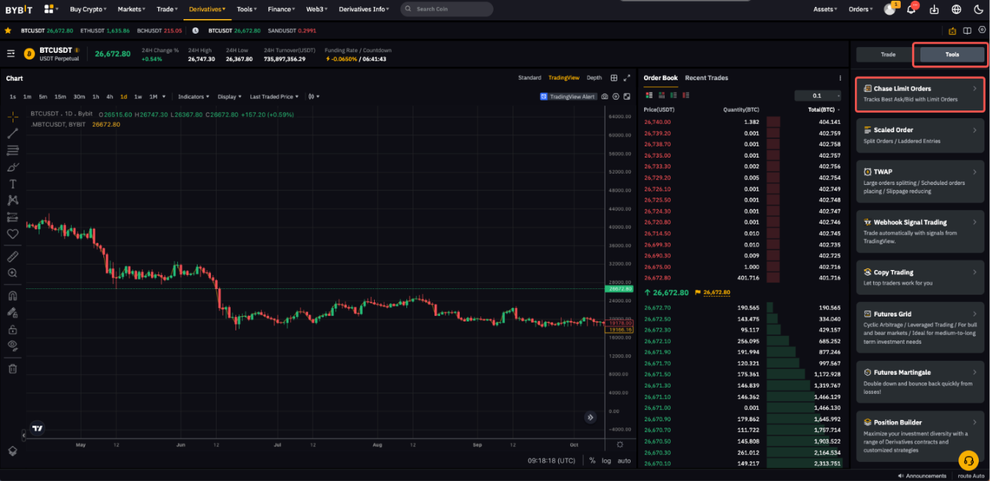Крок 3. На вебсайті Bybit натисніть вкладку Інструменти і виберіть лімітні ордери зі слідуванням