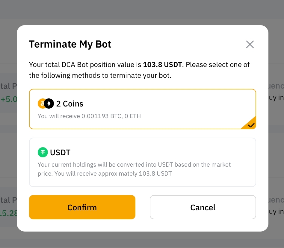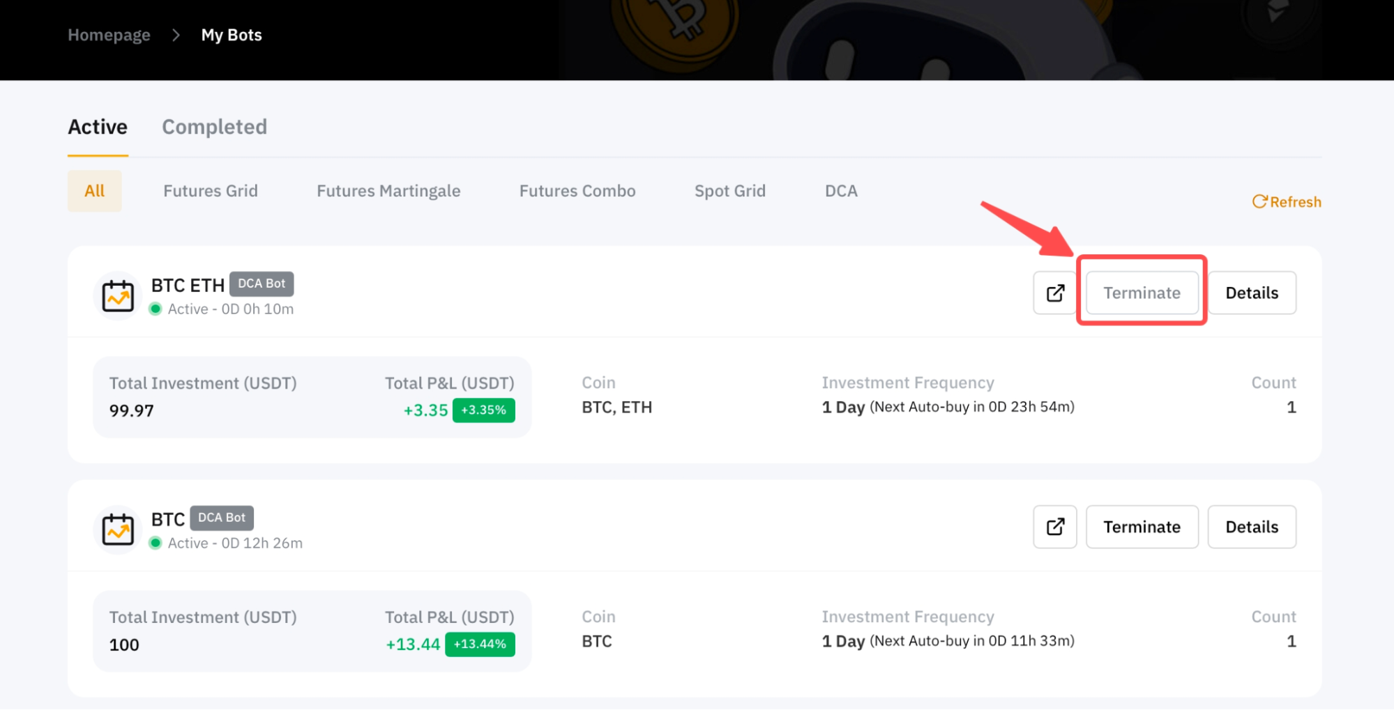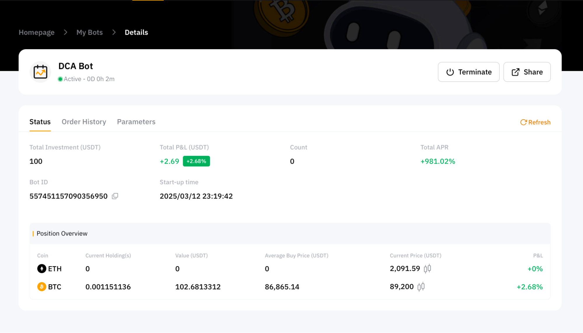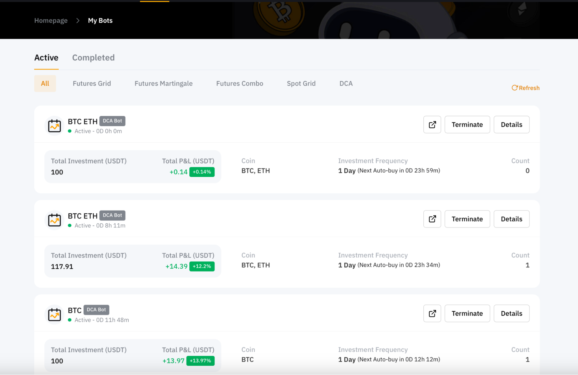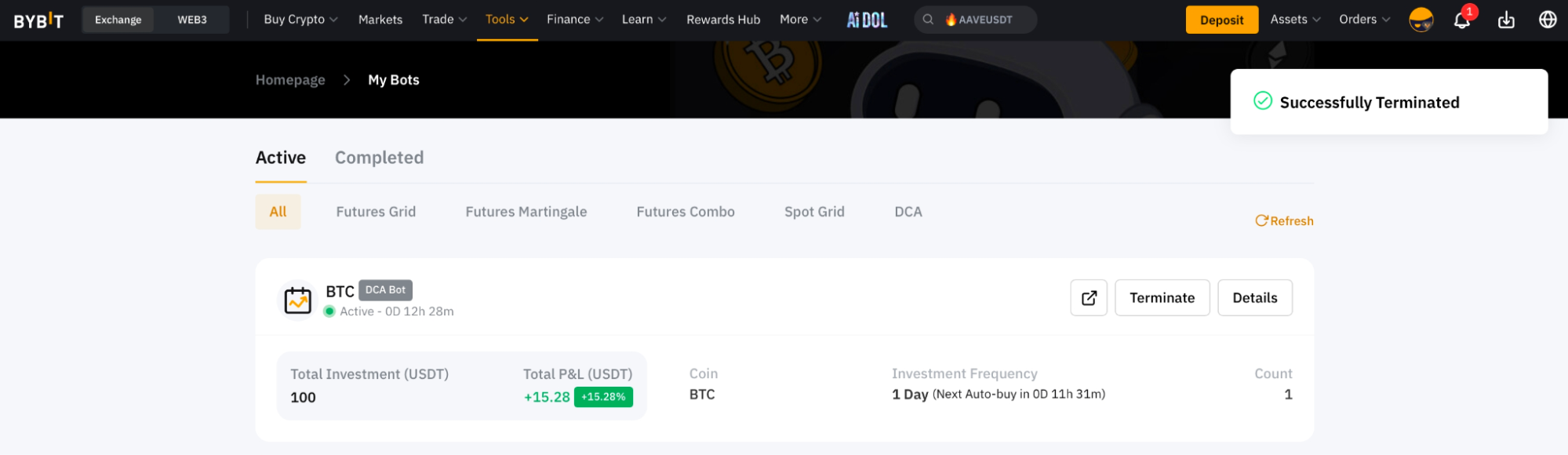 Після того, як ви натиснете на Підтвердження, сторінка буде автоматично перенаправлена на сторінку Мої боти, щоб ви могли переглянути своїх активних DCA-ботів.