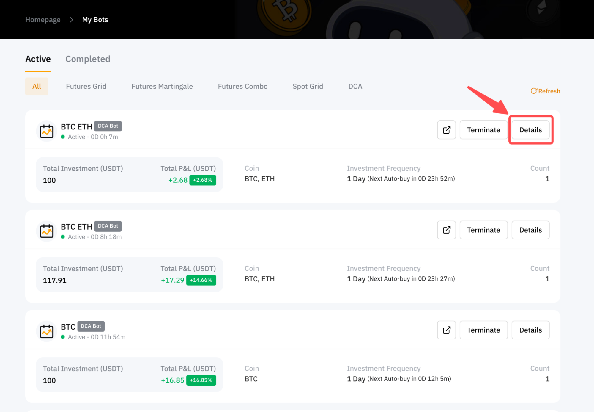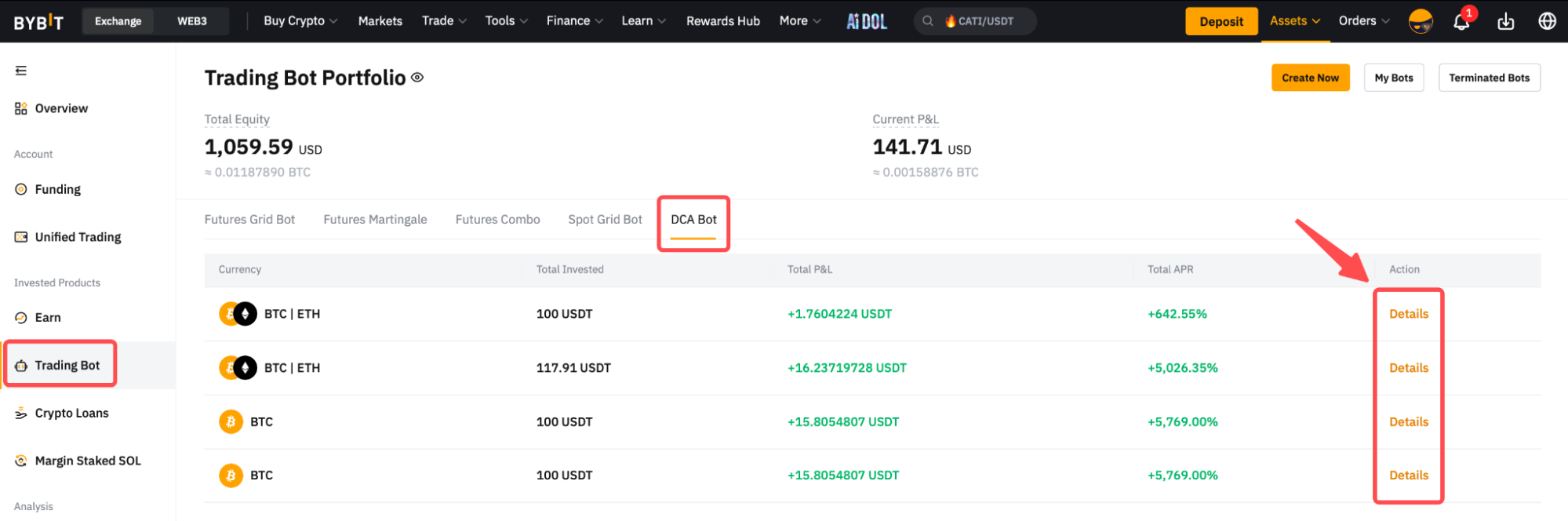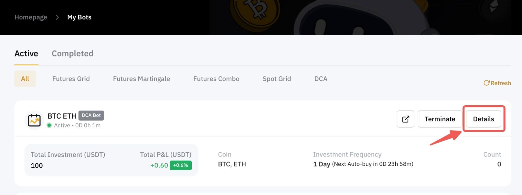 Крок 1. Натисніть Переглянути моїх ботів у верхньому лівому куті сторінки Торгового бота Bybit. Потім натисніть на Деталі в правому верхньому куті DCA-бота, параметри якого ви хочете змінити.