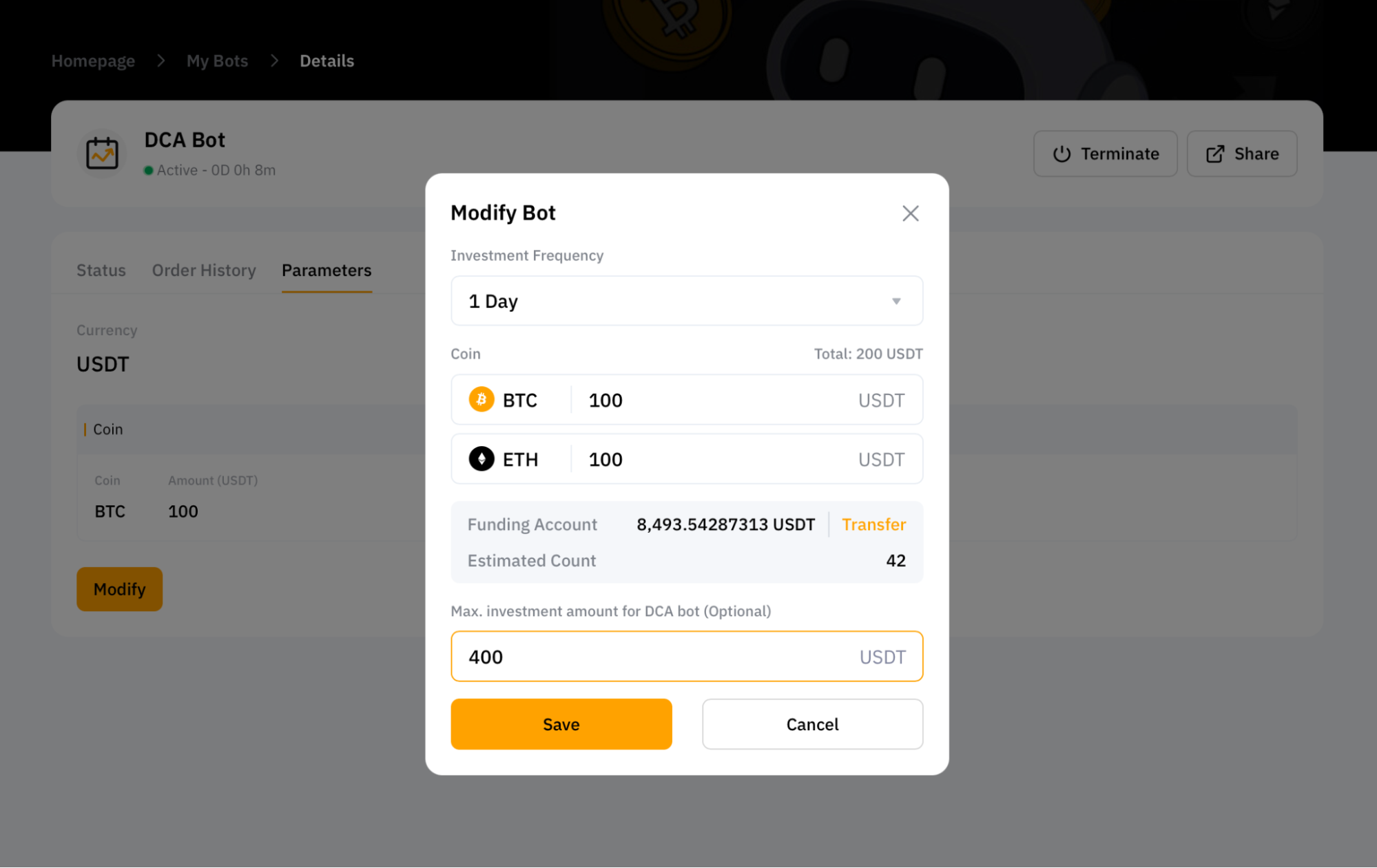 *Якщо загальна сума інвестицій перевищить максимальну суму інвестицій, DCA-бот автоматично завершить роботу, і всі активи будуть переведені на ваш акаунт фінансування.