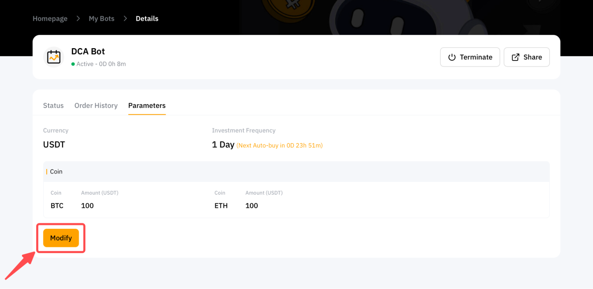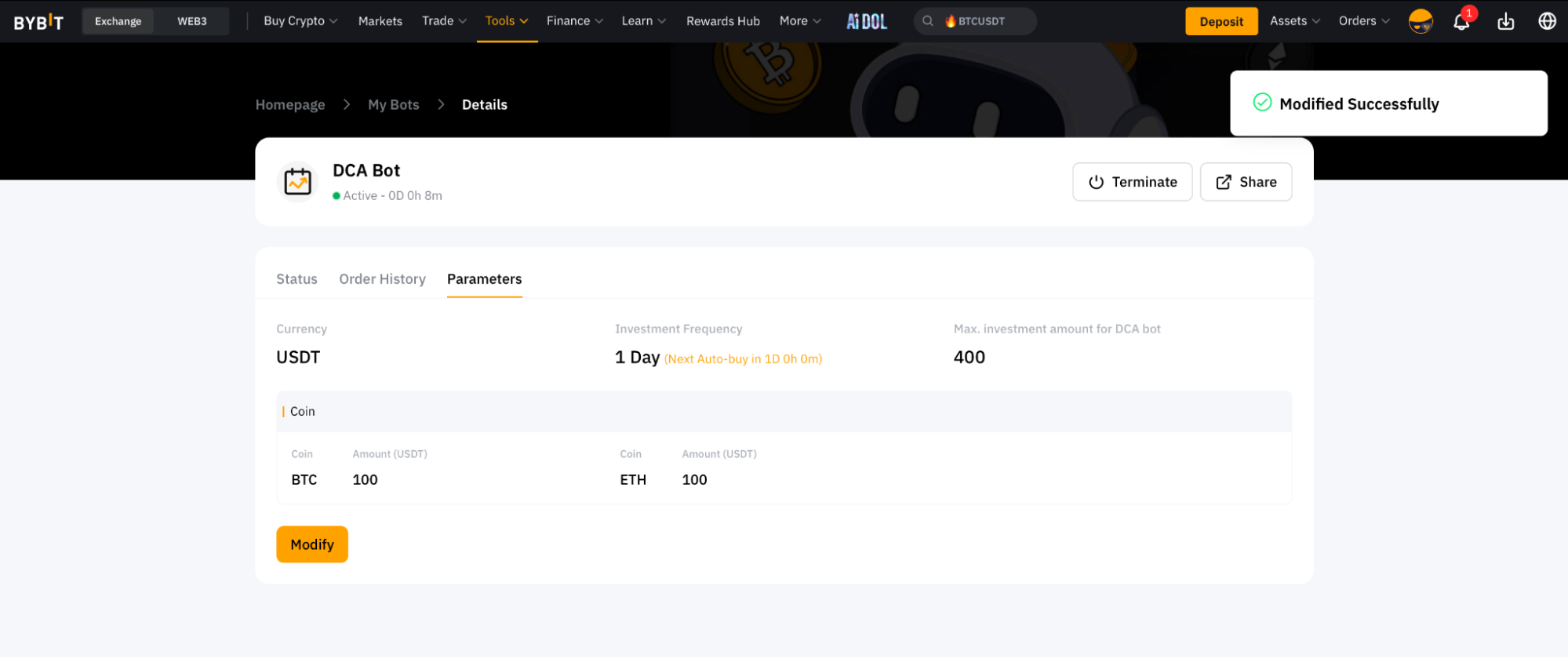 — Нова торгова стратегія DCA набуде чинності відразу після того, як параметри будуть змінені і успішно збережені.
