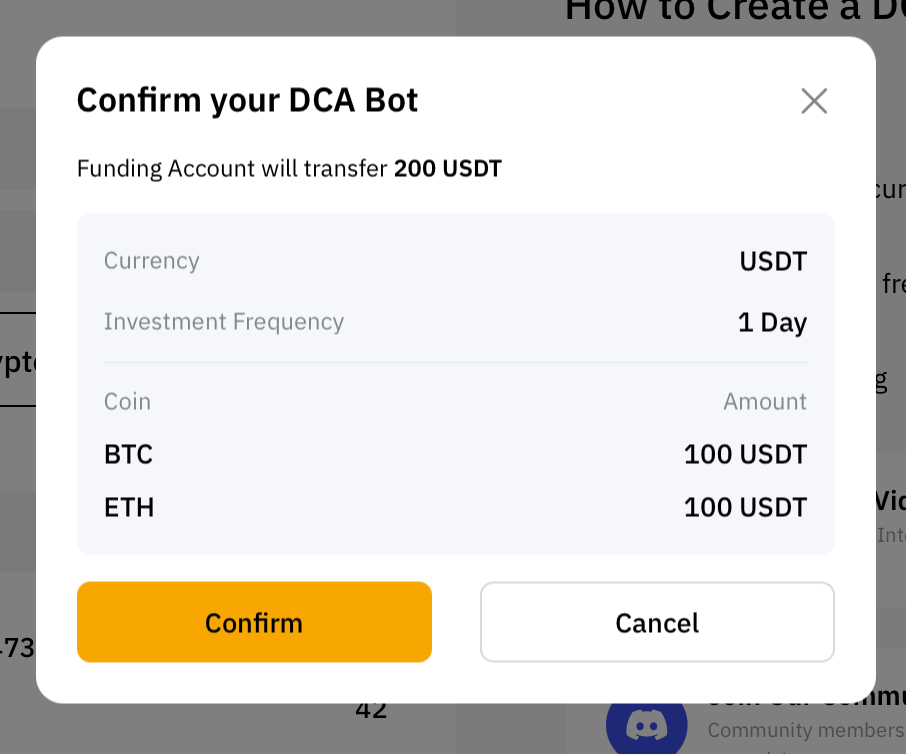 Крок 4: Перевірте уважно створену вами інформацію про DCA-бота, а потім натисніть Підтвердити, щоб почати торгівлю.