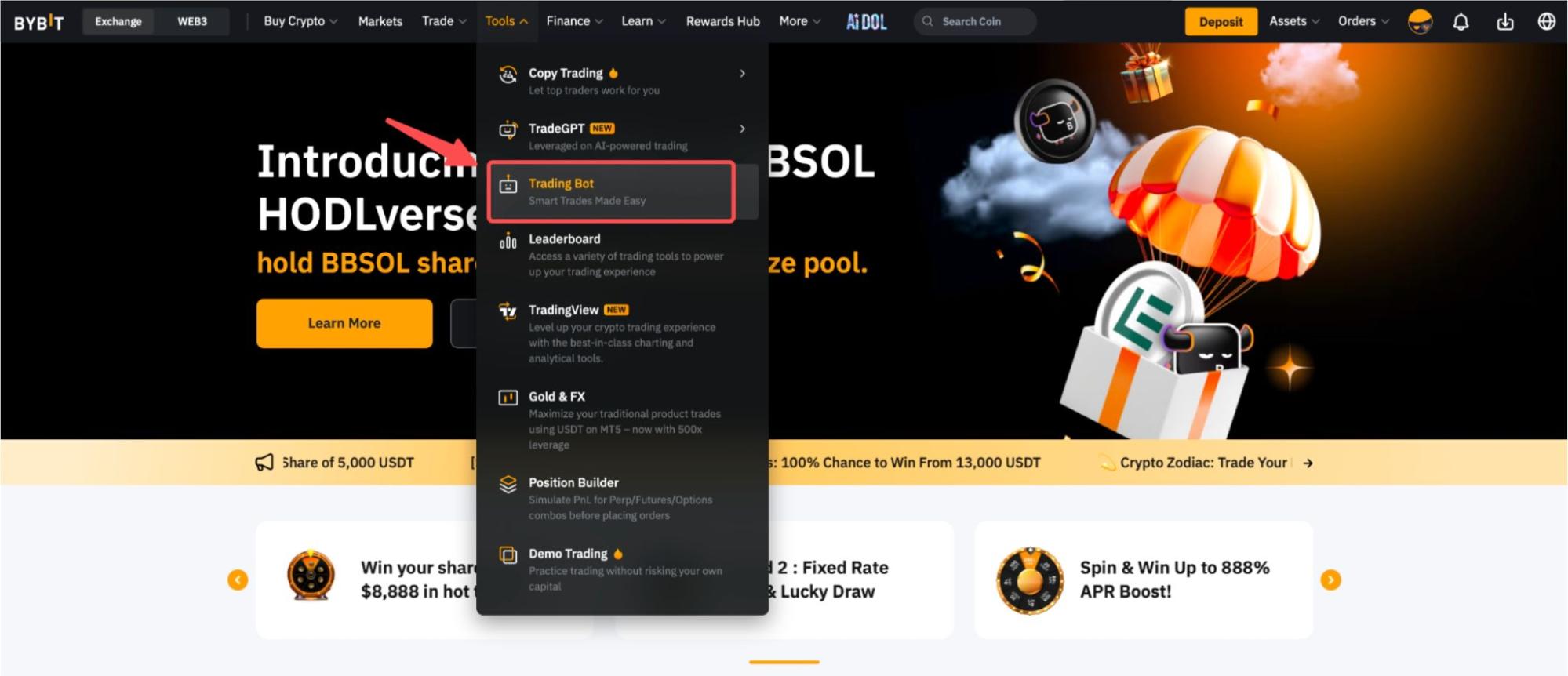 Крок 1. Натисніть Інструменти → Торговий бот на навігаційній панелі, щоб перейти на сторінку Торгового бота Bybit.