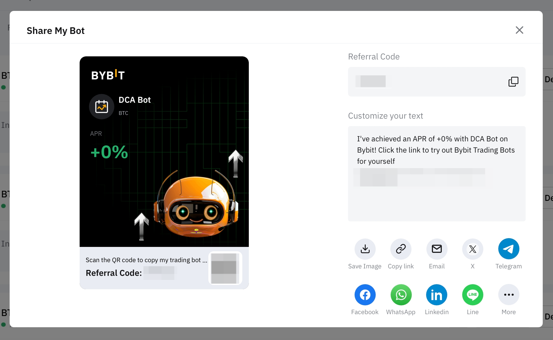 Крок 1. Щоб перейти на сторінку Мої боти, будь ласка, натисніть Переглянути моїх ботів на торговому боті Bybit. Потім натисніть Поділитися в правому верхньому куті стовпця DCA-бота, щоб поділитися.
