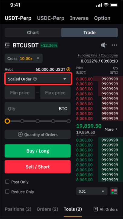 Зверніть увагу, що мінімальна та максимальна загальна кількість для масштабованого ордера в 10 разів перевищує мінімальний та максимальний розміри ордера. Наприклад, мінімальний і максимальний розмір замовлення для BTCUSDT становить 0,001 BTC і 100 BTC відповідно. Як наслідок, мінімальна та максимальна загальна кількість ордера для масштабованого ордера становитиме 0,01 BTC та 1000 BTC відповідно.