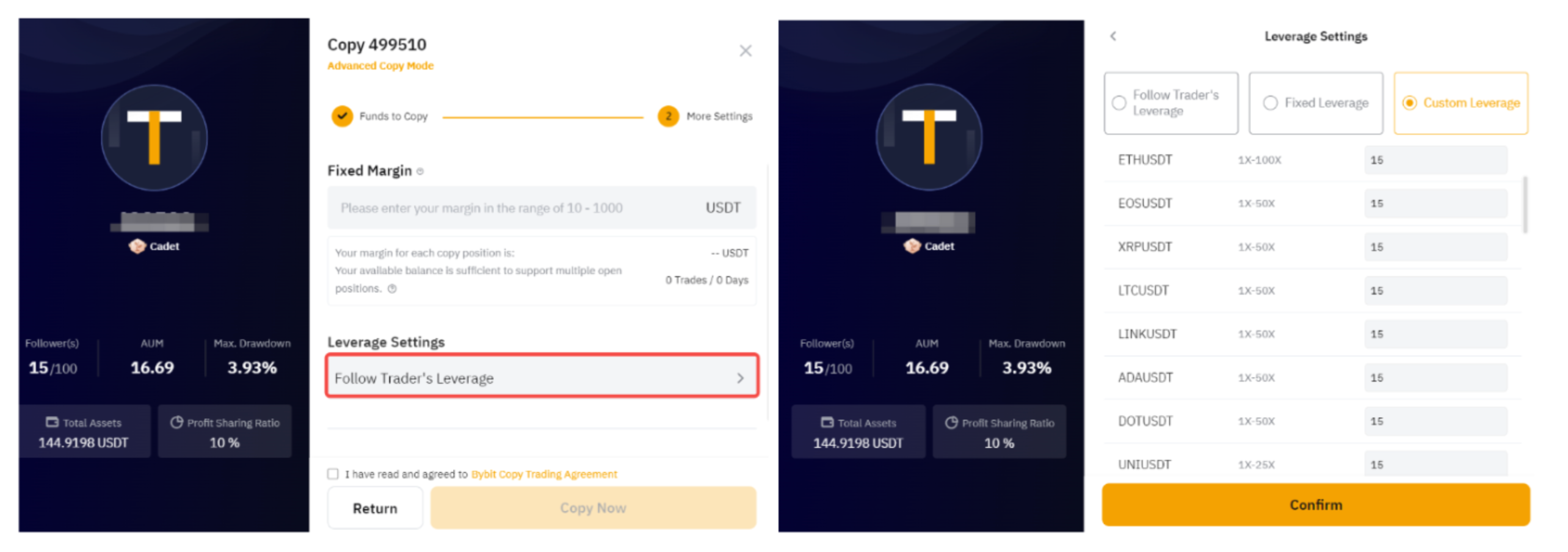 Người theo dõi có thể tăng số tiền đầu tư cho Nhà Giao Dịch Chính và sau khi Nhà Giao Dịch Chính thực hiện hành động giao dịch mới, chẳng hạn như đặt lệnh mới hoặc điều chỉnh đòn bẩy, đòn bẩy sẽ được tự động điều chỉnh. Tuy nhiên, nếu Nhà Giao Dịch Chính không có hành động giao dịch mới nào, hệ thống sẽ không tự động cập nhật thay đổi đòn bẩy cho người theo dõi. Trong trường hợp này, bạn có thể điều chỉnh đòn bẩy của mình theo cách thủ công với đòn bẩy mới nhất của Nhà Giao Dịch Chính bằng cách đi tới Cài Đặt Sao Chép Giao Dịch của Nhà Giao Dịch Chính tương ứng và nhấp vào Cấu hình cài đặt. Điều này sẽ cho phép hệ thống kiểm tra lại số tiền ký quỹ khả dụng của bạn và định cấu hình lại đòn bẩy.