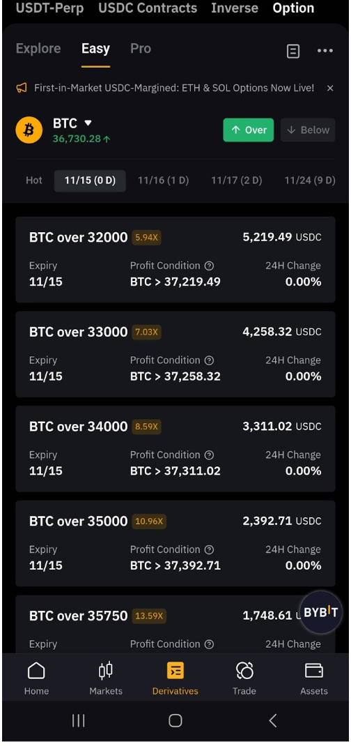 要访问 Bybit 简易期权,请先打开 Bybit App。在首页,选择合约,然后轻点期权。系统将跳转至 Bybit 期权页面,您可以根据自己的期权交易经验从 3 种模式中进行选择。