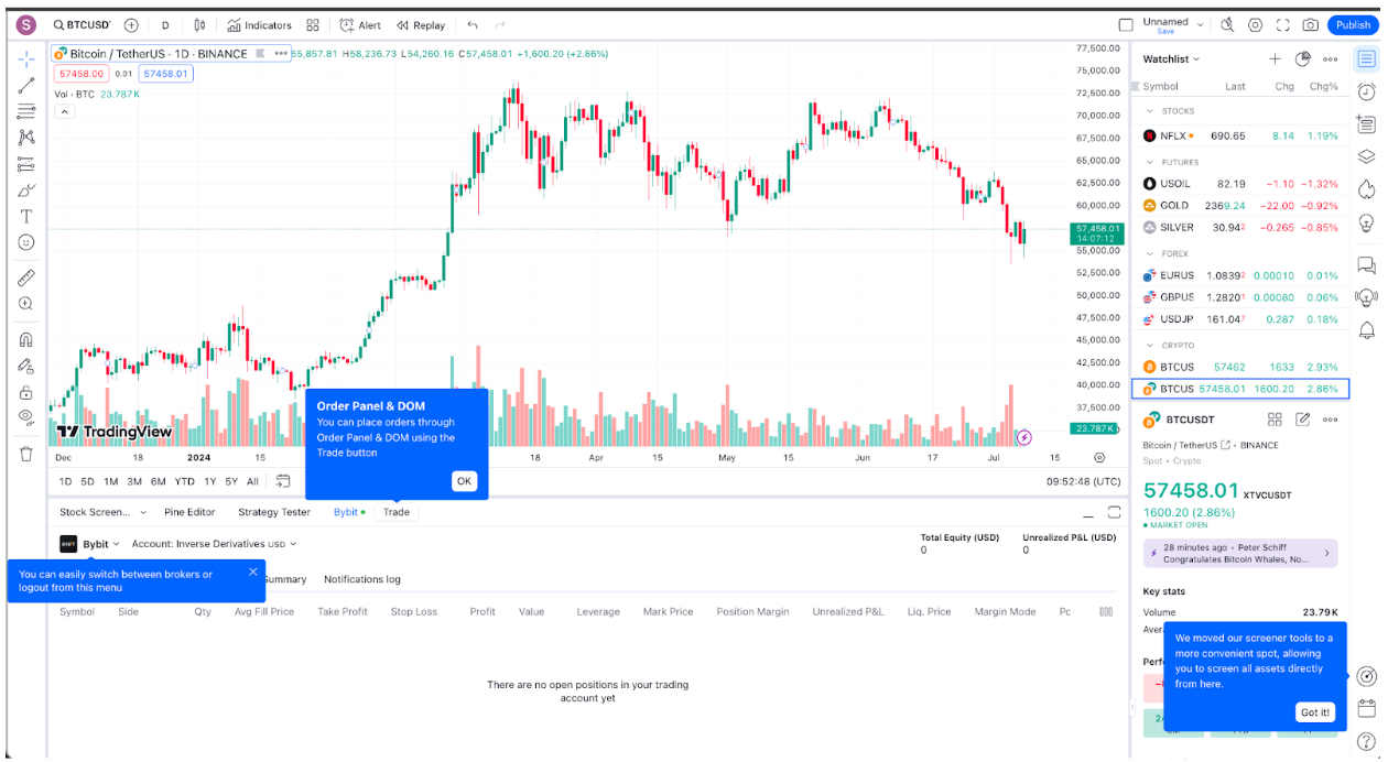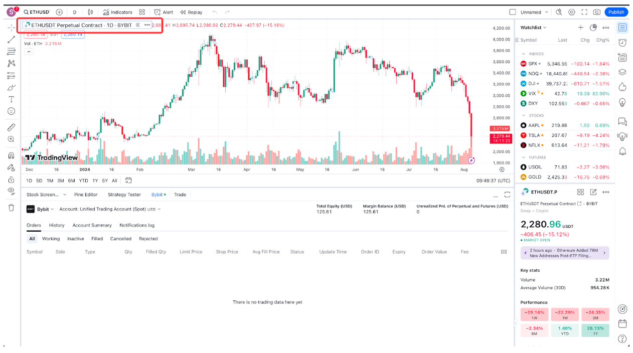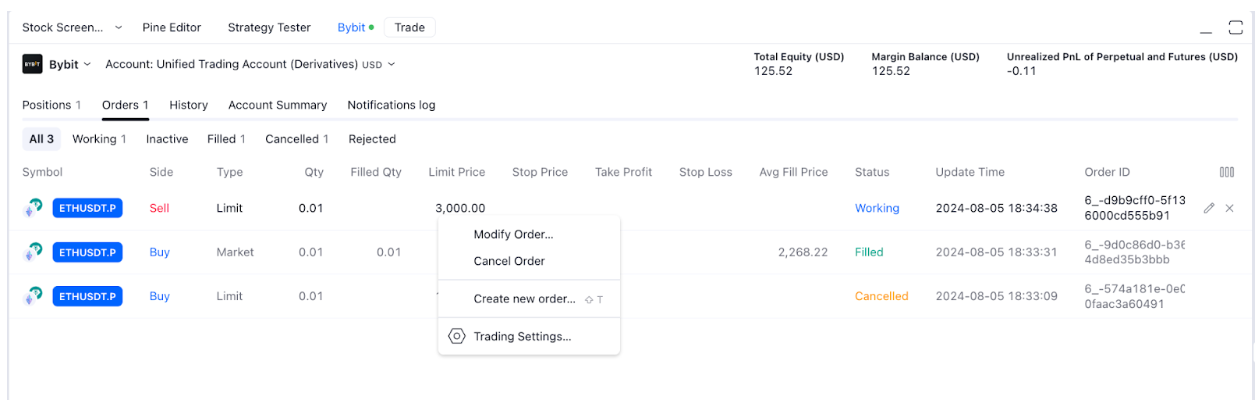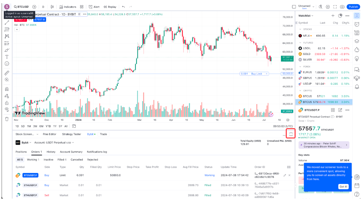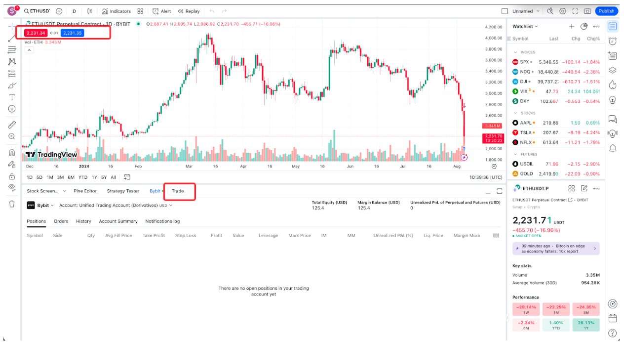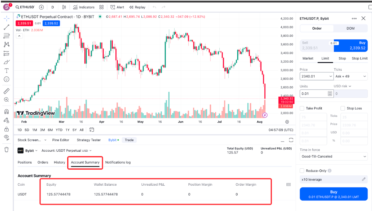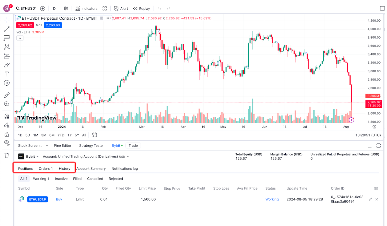 第 5 步:您已连接至 Bybit 经纪商,现在可以使用 TradingView 进行 Bybit 交易了。
