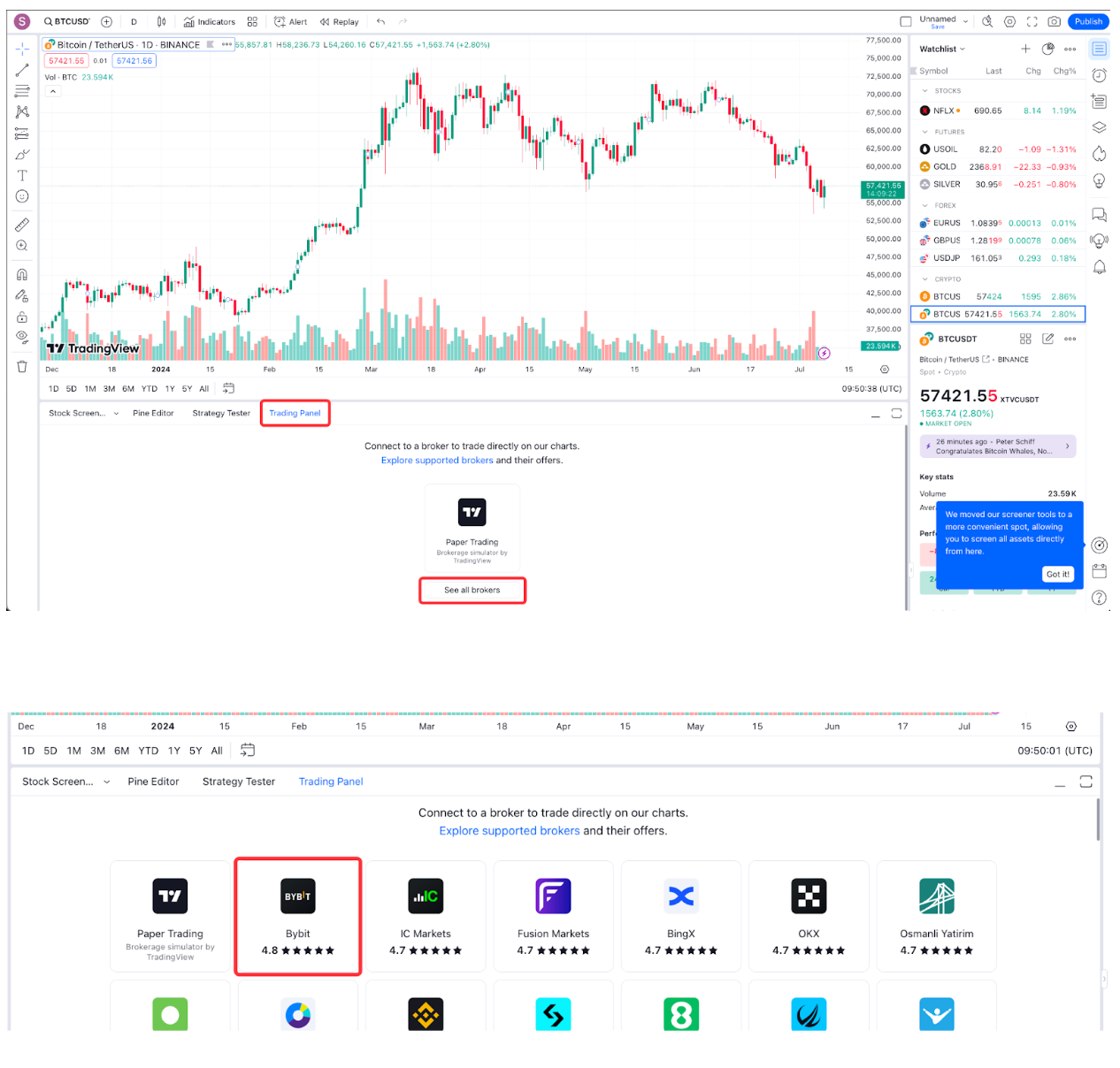 第 2 步:在交易面板中,滚动浏览受支持的经纪商,然后点击查看所有经纪商 → Bybit。