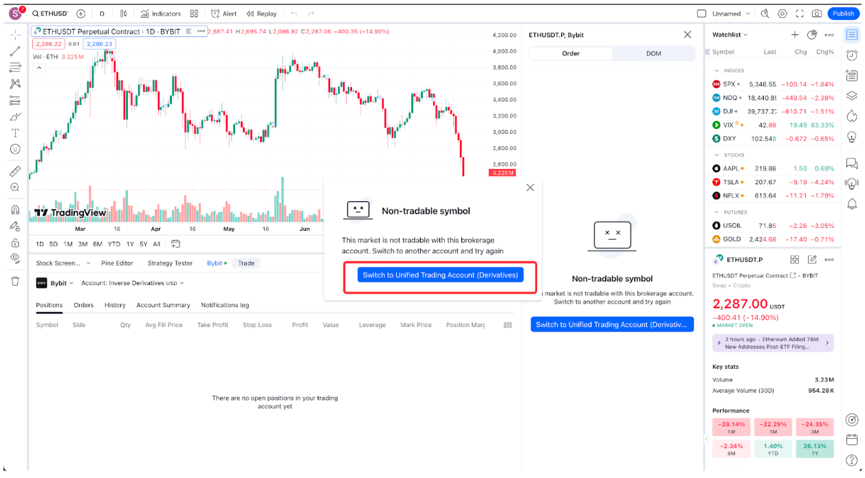 请注意,在 TradingView 上与经纪商连接后,出于安全目的 TradingView 有施加相关限制,链接状态只能维持 24 小时。点此详细了解如何在 TradingView 中进行 Bybit 交易。