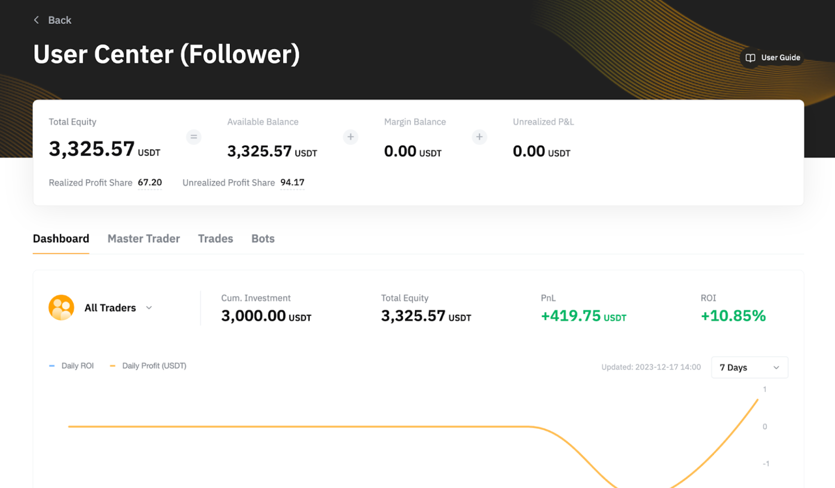 在跟单交易的跟单用户中心,用户可以查看自己的跟单交易账户概况、所跟单的交易达人当前或过去的交易表现以及订单详情。
