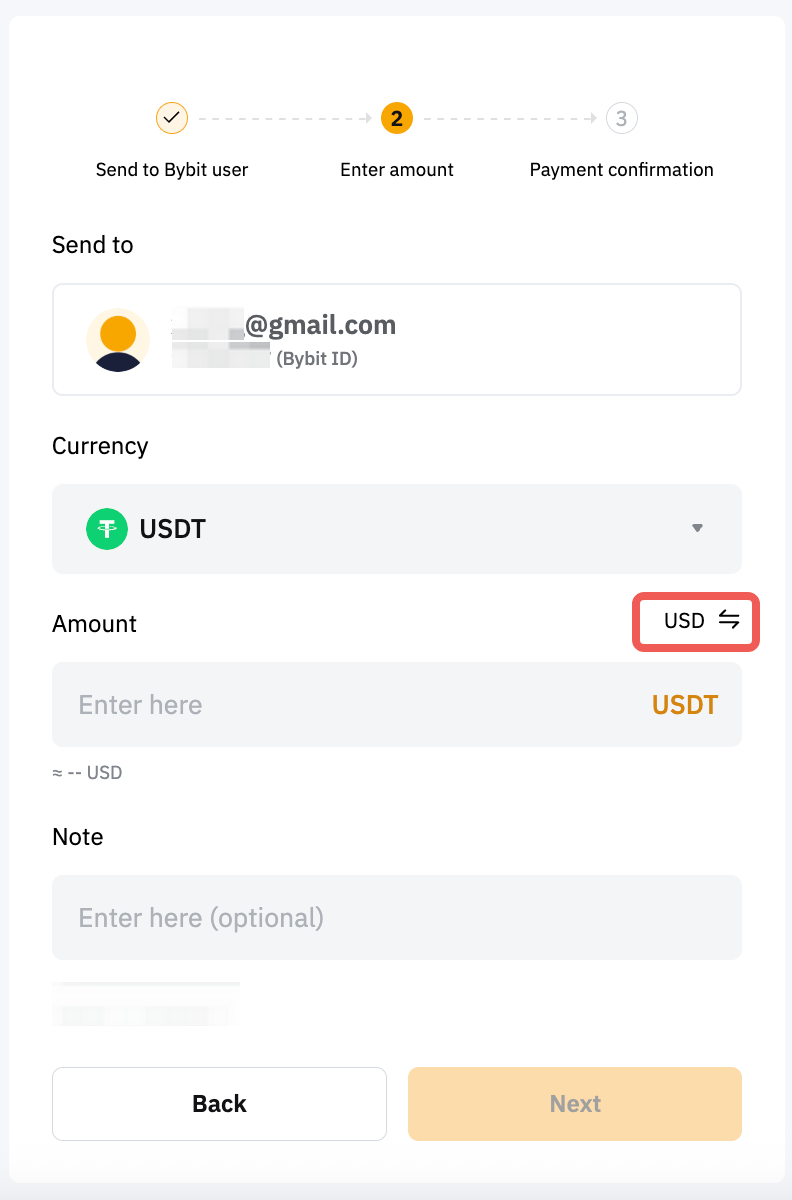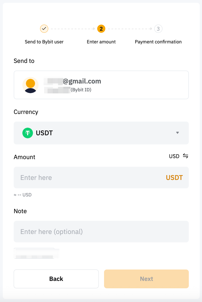 第 2 步:选择内部转账付款方式。您可以输入以下账户信息付款给其他 Bybit Pay 用户:
