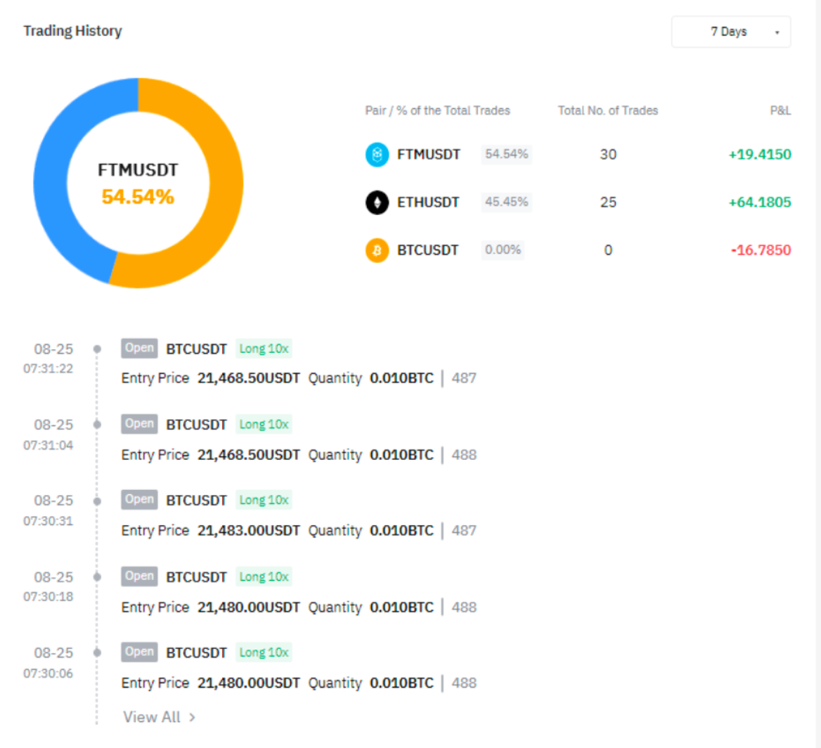 交易记录下的交易品种/占比、总交易次数及交易盈亏将于每日 00:00 (UTC) 更新。此外,交易达人发起的每笔交易都会在此处实时显示。请注意,此处仅显示USDT永续的交易历史。