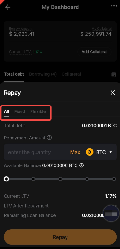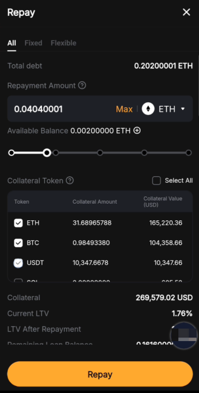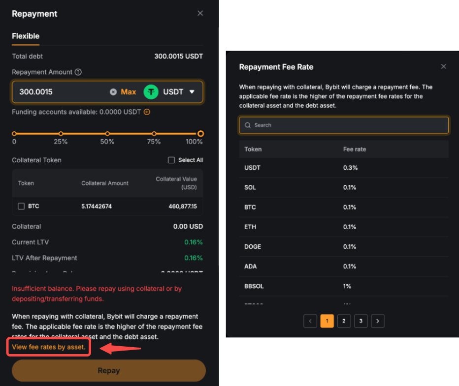 您可以在還款頁面點擊“按資產查看費率”,查看支持的代幣完整列表及其各自的還款費率。
