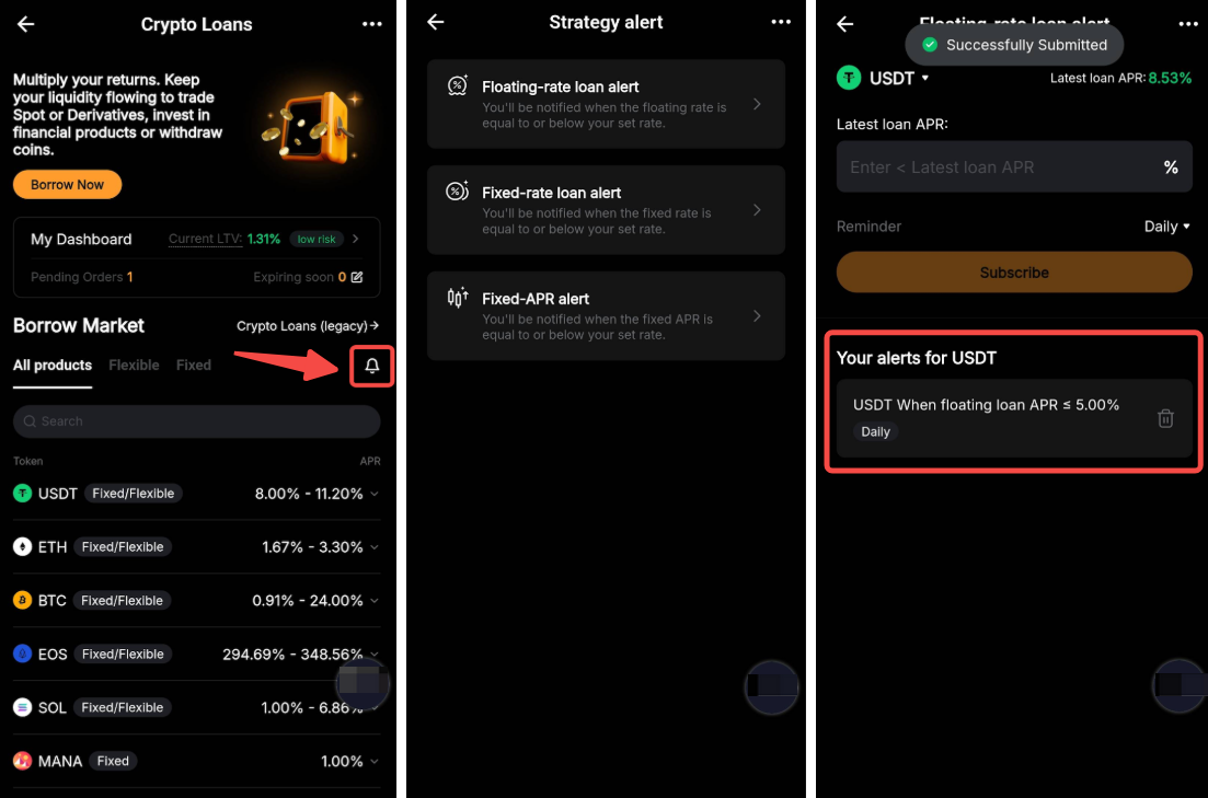 可以,您可以登入 Bybit App 設定質押借幣貸款策略提醒。請前往質押借幣頁面,點擊鈴鐺圖標,選擇策略提醒類型(浮動利率、固定利率或固定利率存幣),選擇代幣,並設定利率,當利率達到或低於目標時,您將收到通知。